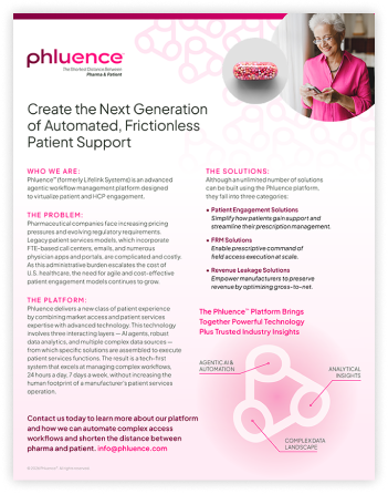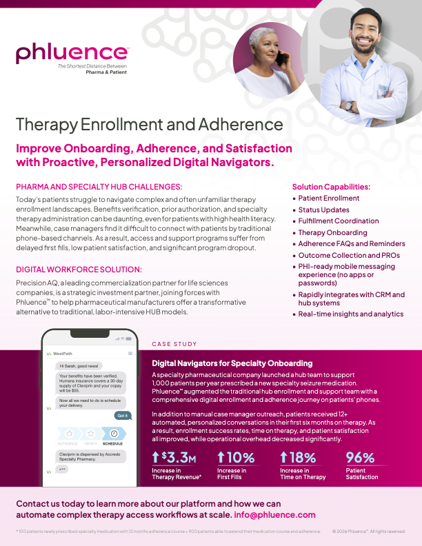 A patient’s diagnosis of a condition or disease marks the beginning of an often years-long therapy journey. Even for patients with high health literacy, the process can be daunting. Read more about how Phluence helps pharmaceutical manufacturers offer a transformative alternative to traditional, labor-intensive HUB models, streamlining benefits verification, prior authorization, and specialty therapy administration.